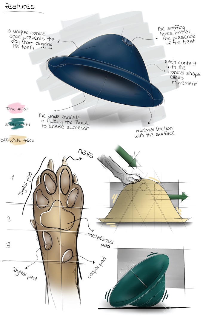 Drawing from extensive behavioral research conducted with dogs, we specifically tailored the product to meet their needs. This includes considerations such as size, bite angles, and specially-designed cone shape, ensuring a frictionless experience. This allows the Bowly to slide away whenever the dog tries to catch it.